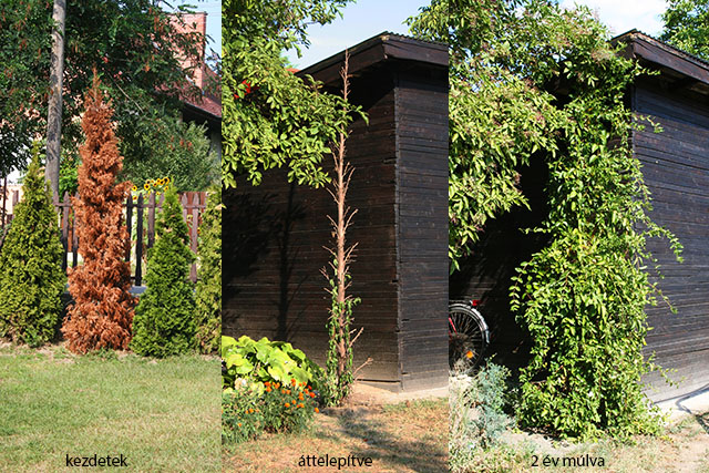 Egy kiszáradt tuja vagy egyéb örökzöld akár az eredeti helyén maradva is kiváló kúszónövények futtatására, de sekély gyökérzete miatt át is lehet tenni egy megfelelőbb helyre.